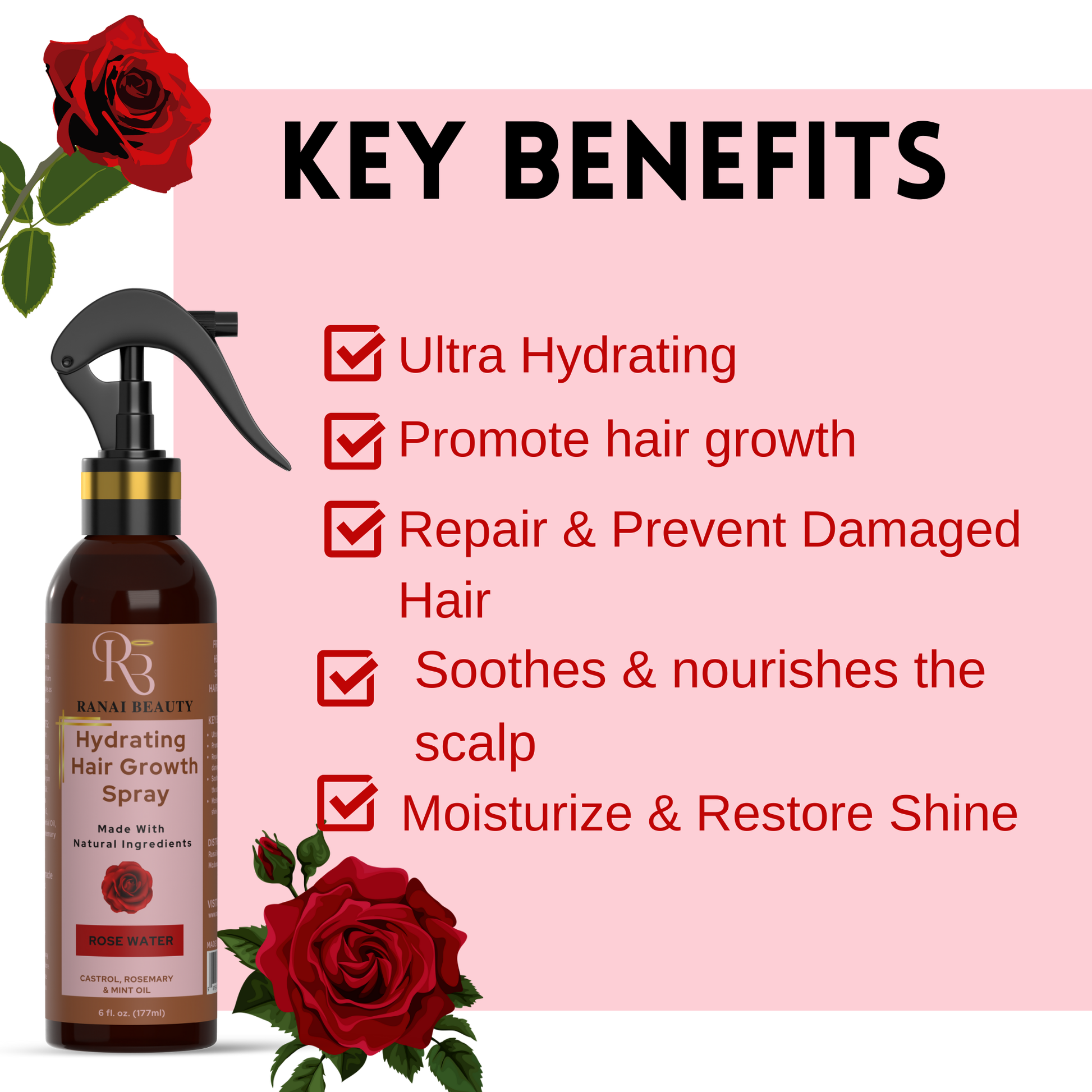 Refresh your hair with our Hydrating Hair Growth Spray. This specially formulated blend offers intense hydration and deeply cares for your scalp and hair, encouraging stronger, healthier growth. Enriched with calming rose water and boosted by castor,