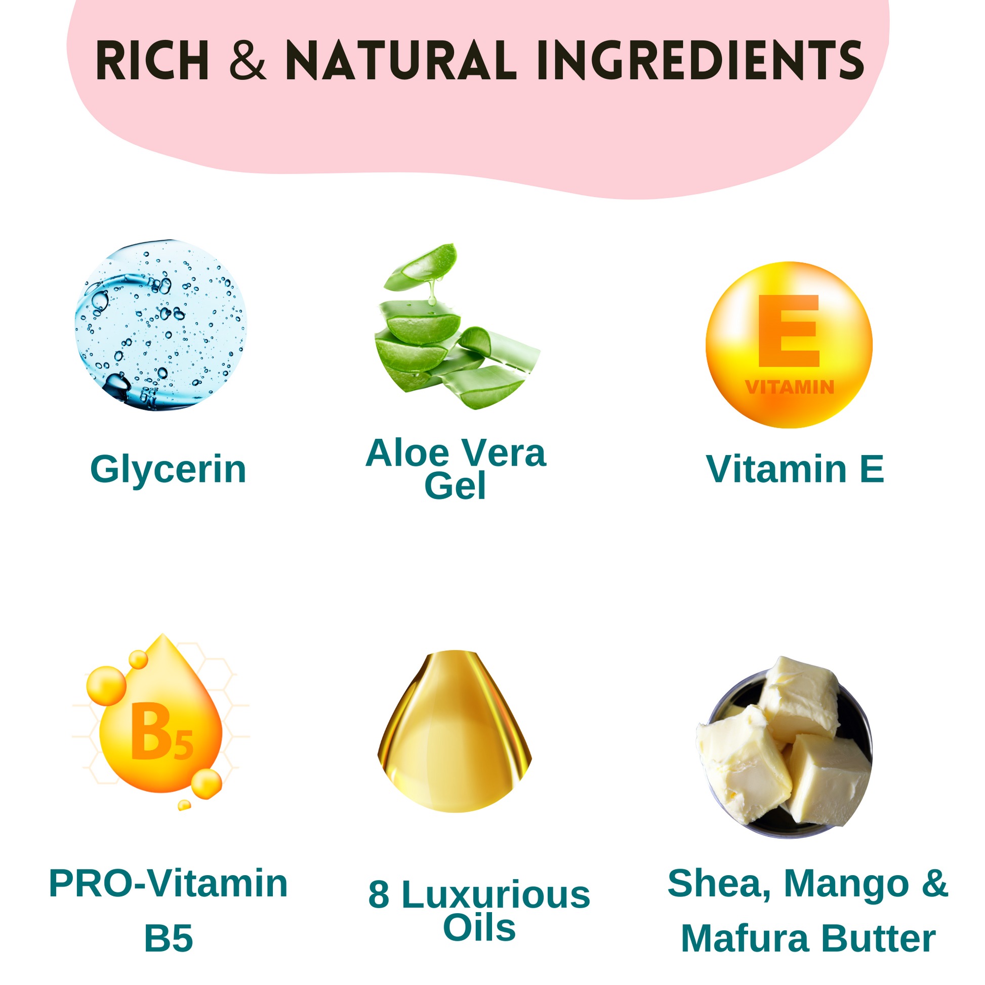 Distilled water, Vegetable glycerin, Aloe Vera Juice, BTM-50, Sunflower Oil, Avocado Oil, Cetyl Alcohol, Mango Butter, Shea Butter, Aloe Vera Gel, Propanediol, Olive Oil Jojoba Oil, Mafura Butter, Castor Oil, Vitamin B5, Preservative, Peppermint Oil, Rosemary Oil, Vitamin E Oil, Citric Acid, L-Arginine.